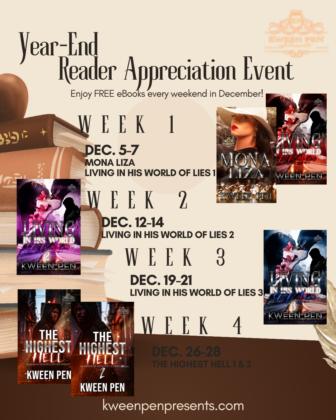 This December, as a special thank you to all my readers, a different eBook will be FREE to download on Kindle every weekend! Set your alarms for a reminder to download your copies! You won't want to miss out on this month-long deal!